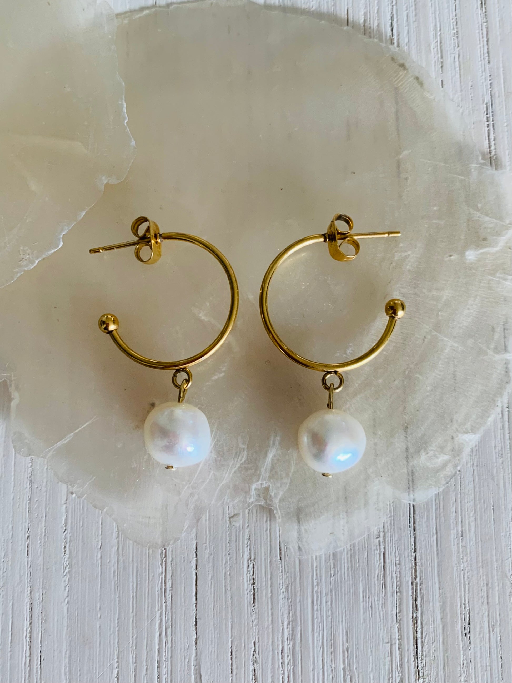 • Boucles d’oreilles demi-créoles en acier inoxydable doré et perles d’eau douce naturelles