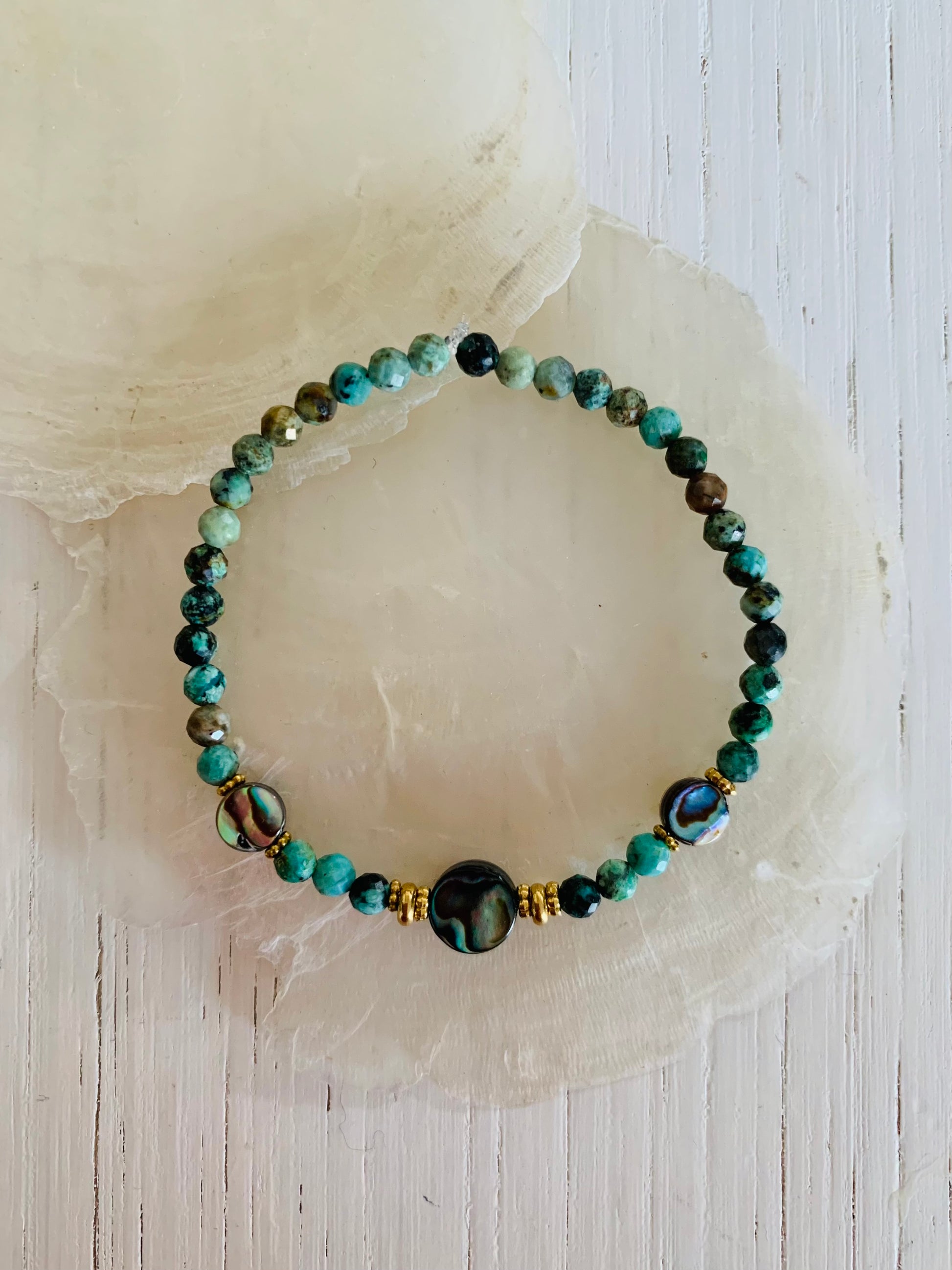 • Bracelet élastique en turquoise africaine, abalone et en acier inoxydable doré