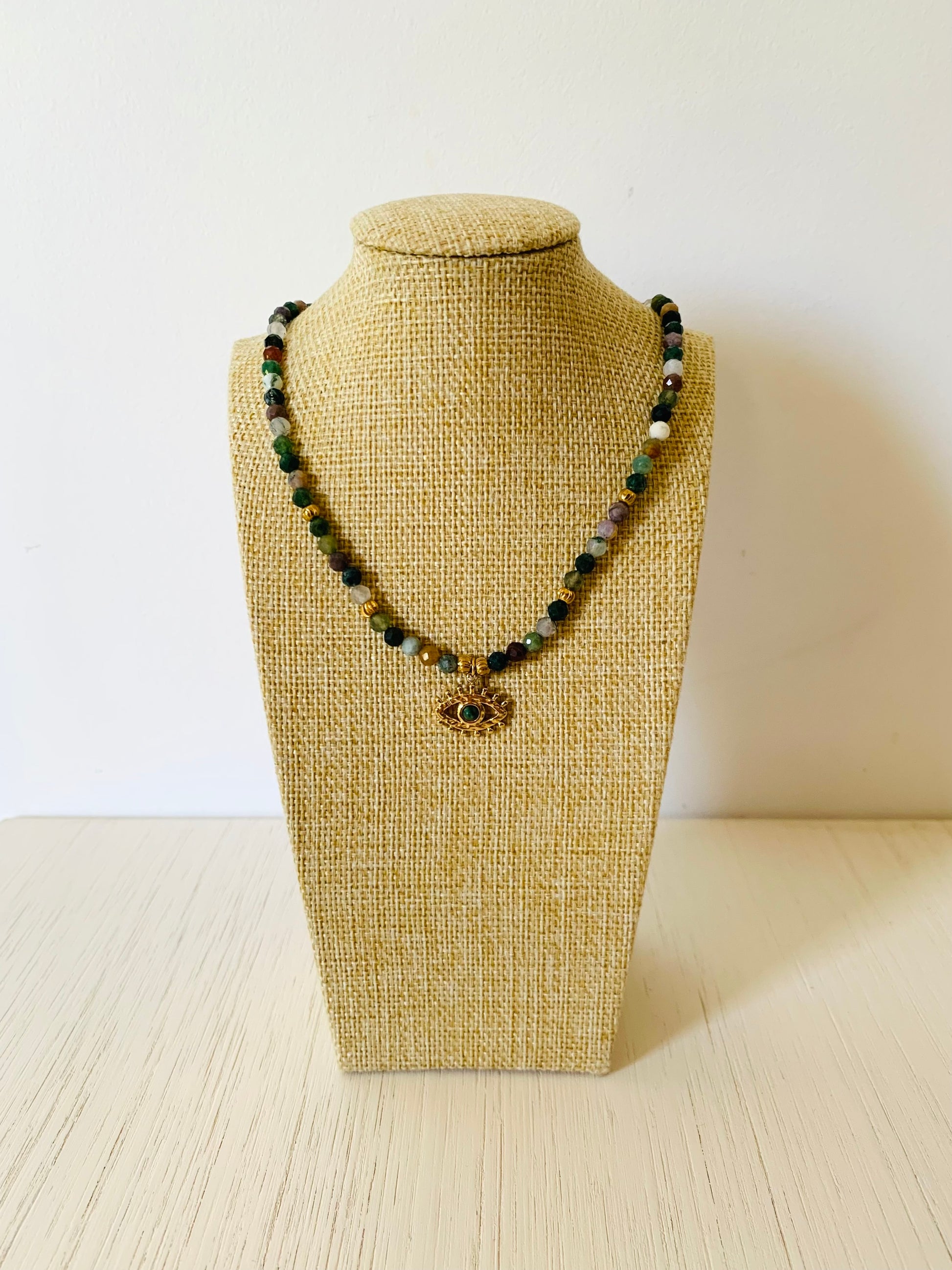 • Pendentif œil protecteur en acier inoxydable doré serti d’une agate indienne